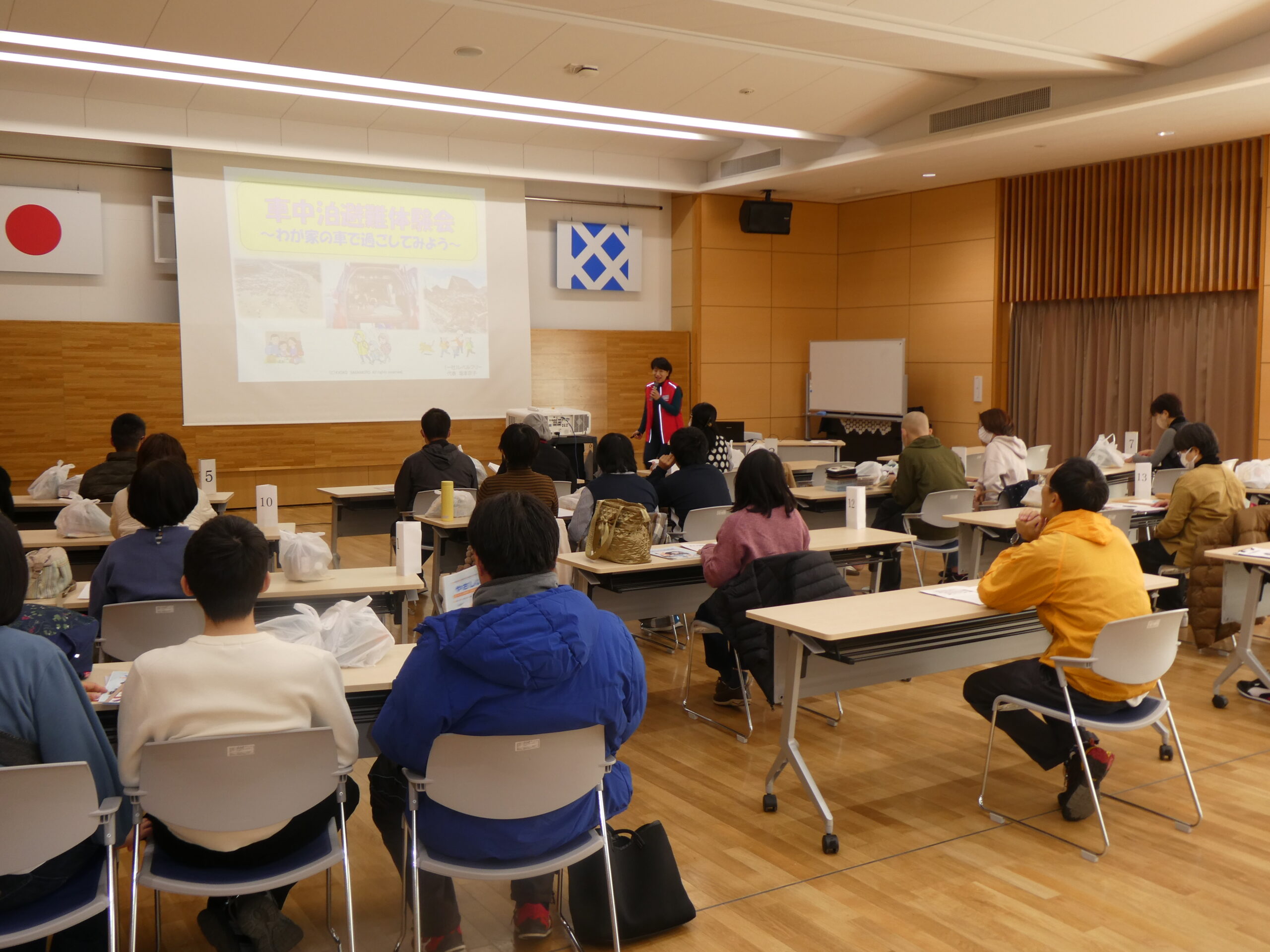 講演でいろいろなことを学べた。後半の車中泊訓練も子ども2人も車内で快適に過ごせた。別の避難訓練に参加した時は、「聴覚障がい者」が対象で、「ビブス」を着て過ごしたが、発達障害にはビブスの貸出しなど障害者向けの準備はあるのか?