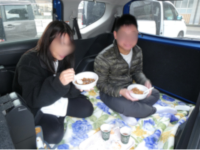自分の車のアレンジができて良かった。ひざを伸ばせない、など、息子と2人で限界ということもわかった。車内で炊き出しを食べたりして車内で過ごす時間が良かった。今日はお日柄も良いが、そうでないとき、真夏や大雨の時は不安だと思った。貴重な経験をありがとう。